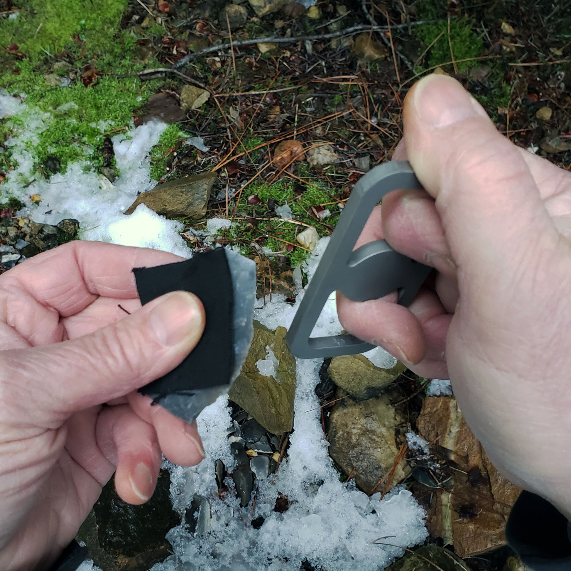 These flint striker multi-tools are laser cut from high carbon steel in a simple rectangular shape that is comfortable and easy to hold. Flint & steel and friction bow drills are foundational skills in the art of primitive survival and bushcraft. Both are based on ancient designs and are the oldest methods for fire-starting. When struck with a piece of flint, small particles of the steel are scraped off that quickly oxidize in the air, turning into sparks through a process know as pyrophoricity. These small sparks can be "caught" with a piece of charred cloth that will grow an ember that can then be used to ignite larger tinder to build a fire. It is a process that takes patience and practice to master, but is an excellent skill to learn as an alternative to modern fire lighting techniques. These strikers also feature a depression in the center face of the tool for a bow drill spindle. The hard steel provides a low friction bearing point, concentrating the friction on the fireboard and allowing for smooth strokes on your way to creating an ember.